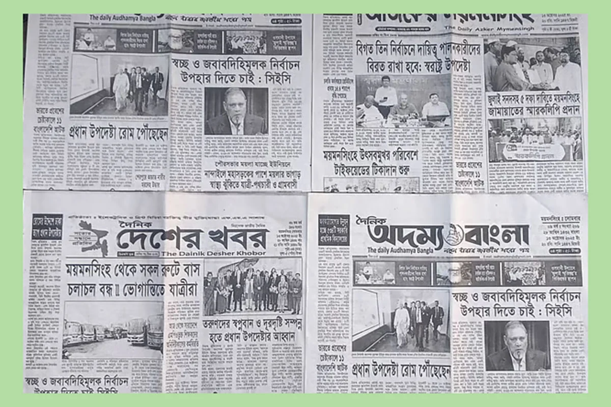 চলতি বছরের ৮ এপ্রিল দুটি পাতার সব প্রতিবেদন হুবহু প্রকাশ করার অভিযোগে ময়মনসিংহ থেকে প্রকাশিত ১১টি সংবাদপত্রের ঘোষণাপত্র (ডিক্লারেশন) বাতিল করেছে জেলা প্রশাসন। গত বৃহস্পতিবার ১১টি সংবাদপত্র বাতিলের আদেশ জারি করা হয়। তবে রবি ও সোমবার সংশ্লিষ্ট সংবাদপত্রের লোকজনের কাছে ডিক্লারেশন বাতিলের চিঠি পৌঁছানো হয় বলে প্রশাসন জানিয়েছে।